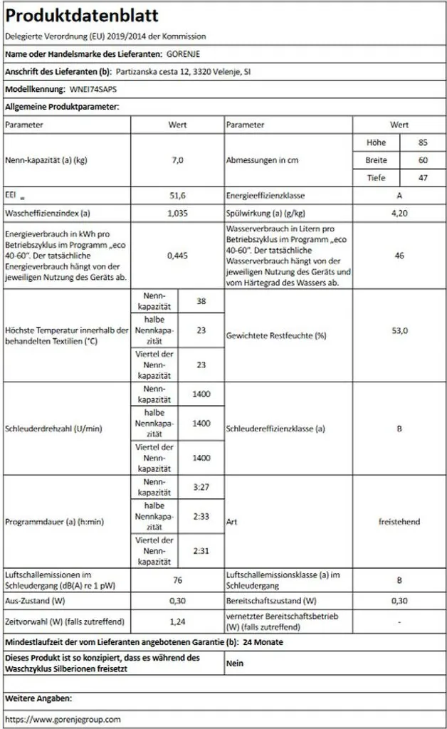 - WaschvollautomatSchleuderwirkungsklasse: BLuftschallemissionsklasse Schleudern: BGeräuschemission Schleudern dB(A): 76Farbe: WeißStableTechFassungsvermögen waschen: 7 kgTrommelvolumen: 49 lSchleudergeschwindigkeit 1/1: 1400 U/min.Schleudergeschwindigkeit 1/2: 1400 U/min.Schleudergeschwindigkeit 1/4: 1400 U/min.WaveActive TrommelInverter PowerDrive MotorDauer Standardprogramm 30 °C: 67 minDauer Standardprogramm 40 °C: 195 minProgrammdauer im eco-Programm: 207 minDauer Standardprogramm 90/95 °C: 218 minWasserverbrauch (Feinwäsche 30/40 °C): 45 lWasserverbrauch (Baumwolle 40 °C): 51 lWasserverbrauch (Baumwolle 90/95 °C): 55 lWasserverbrauch (Wolle 30 °C): 45 lWasserverbrauch im eco Programm: 46 lEnergieverbrauch im eco Programm: 0.445 kWho 100 Zyklen: 44 kWhLED DisplayEinfache BedienoberflächeStart/PauseProgrammanzahl: 16Programme: Baumwolle|Wolle/Handwäsche|Mix/Synthetics|Pets|ExtraHygiene|Baby-Wäsche|Daily wash|Eco 40-60 °C|Speed 20’|PowerWash 59’|Hemden/Blusen|Daunen|Selbstreinigungs-Programm|Spin/drain|Spülen / EinweichenNormalCare