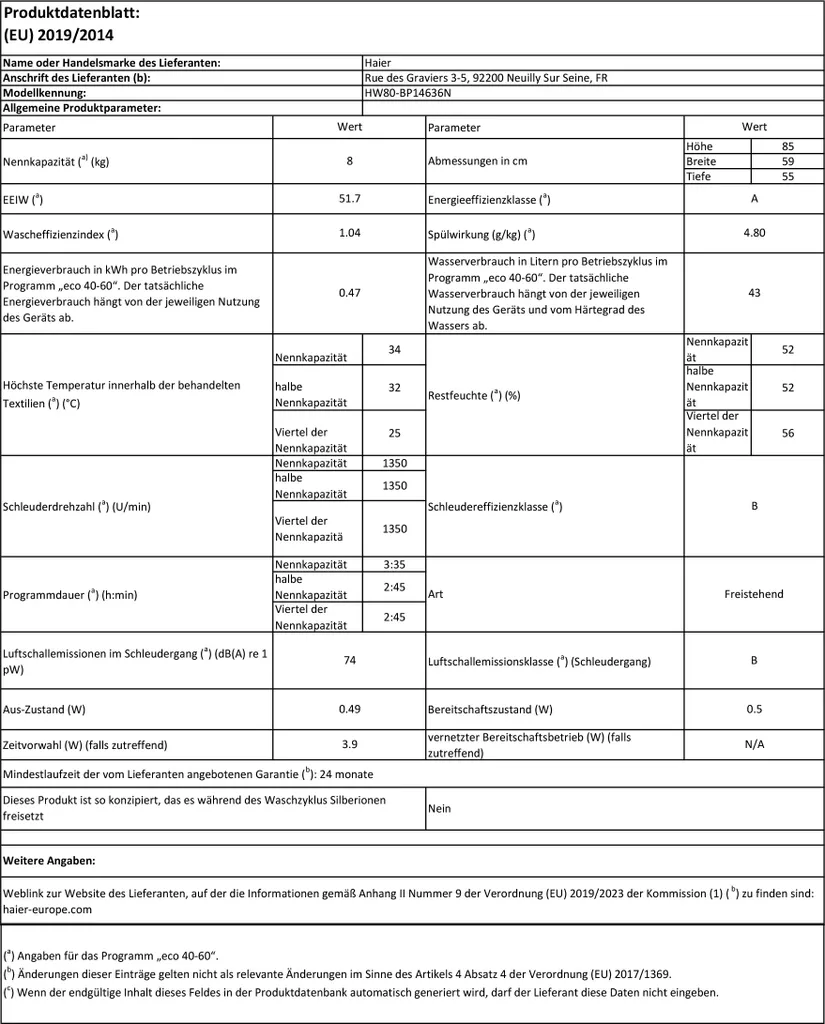 - Gewichteter Energieverbrauch in kWh nach (EU) 2019/2014: 47 kWh