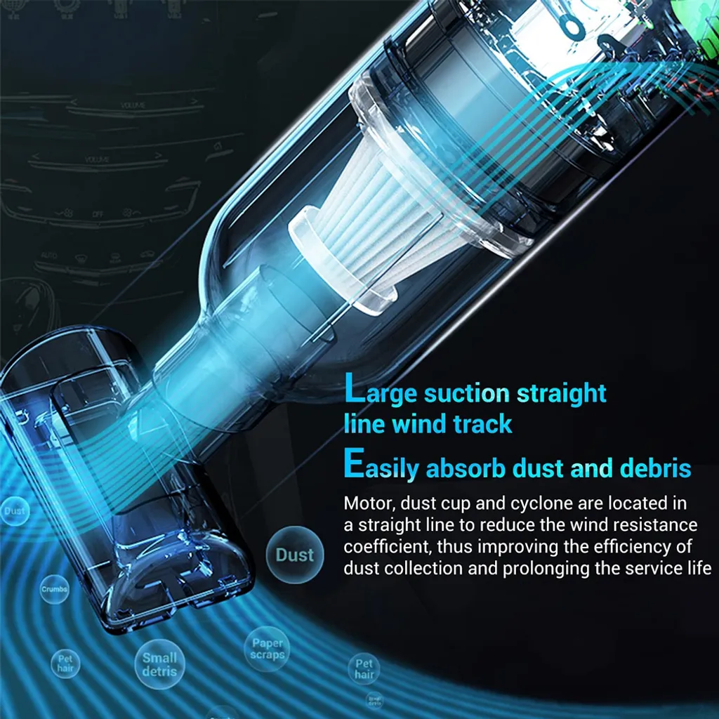 【Große Saugleistung】Unser tragbarer Hochleistungs-Handstaubsauger hat eine starke Saugleistung und eine Nenneingangsleistung von 120 W, die Staub, Tierhaare und Schmutz schnell und gründlich entfernen kann. Dieser Handstaubsauger verwendet eine große Sauglineare Luftspur: der Motor, der Staubbecher, und der Zyklon, befindet sich in einer geraden Linie, so dass die Luftstromeffizienz und die Saugkraft effektiv verbessert werden, was Ihre Reinigungsarbeiten erleichtert.