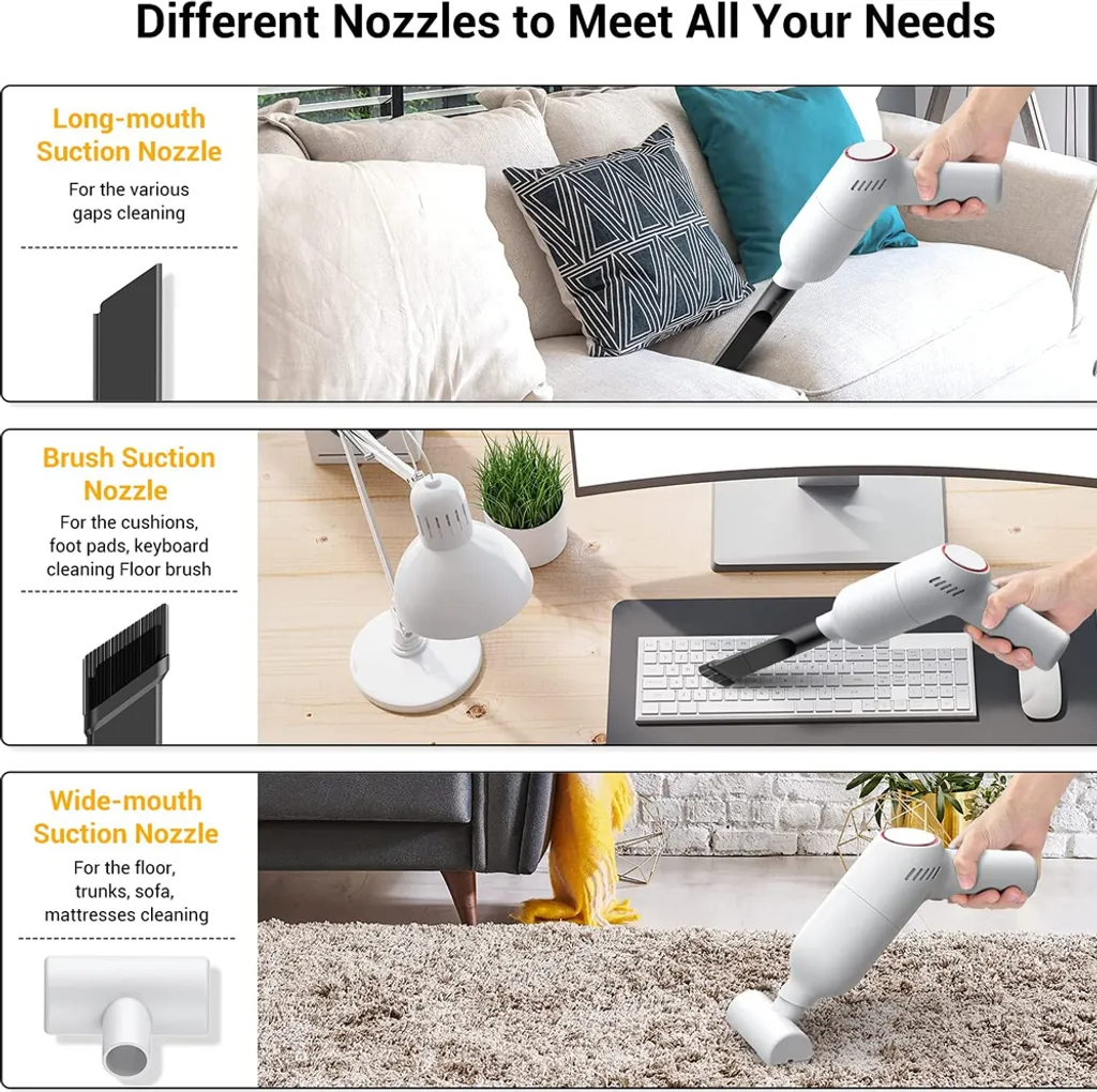 【Breiter Anwendungsbereich】Dieser Mini-Nass-Trockensauger kann an verschiedenen Orten verwendet werden, die gereinigt werden müssen. Sie können es verwenden, um die Lücken im Auto, Sofa, Teppiche, Schreibtisch, Tastaturen und Bücherregale usw. zu reinigen.