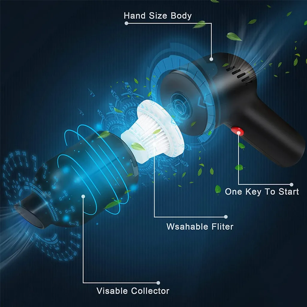 Ergonomisches Design und leicht: Unser Mini-Staubsauger ist ergonomisch, er wiegt nur 0,36 kg und wird sich nicht müde anfühlen, auch wenn er für eine lange Zeit gehalten wird. Wir setzen den Motor und die Batterie hinter den Griff, um die Schwerkraftbalance zu halten, und es ist sehr leicht. Es ist so klein und tragbar, so dass Sie es leicht transportieren und verstauen können.