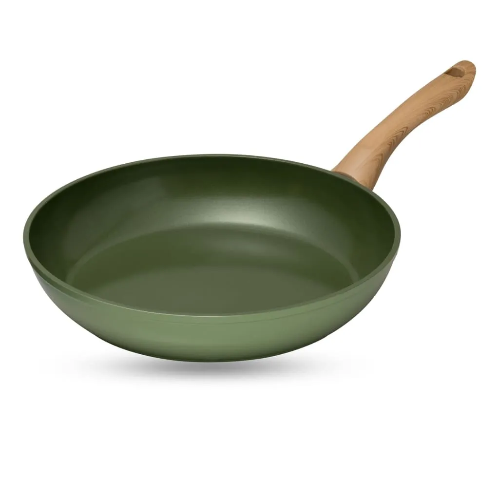 hochwertige Aluminium-Pfanne mit CeraVegan pflanzlicher Keramik-Antihaftbeschichtung auf Basis von Avocado-Öl, zum Braten und Kochen ohne Fett, kratzunempfindlich und robust, gleichmäßige Hitzeverteilung, kein Anbrennen und Anhaften, ideal zum scharfen Anbraten, Griff in Holzoptik, spülmaschinengeeignet, backofengeeignet bis 180 °C, für alle Herdarten geeignet
