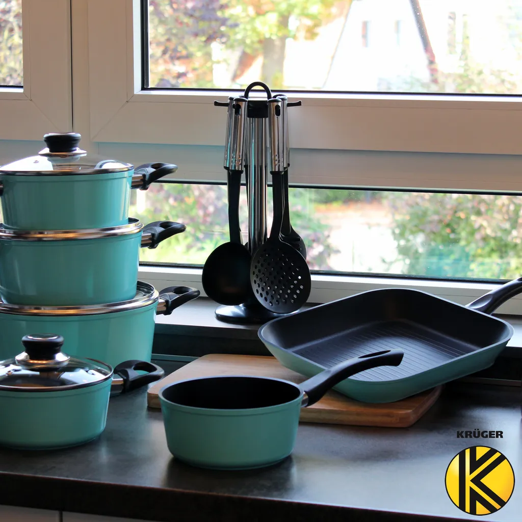 1x Ständer mit Küchenhelfern: 1x Spaghettilöffel, 1x Schöpfkelle, 1x Soßenlöffel, 1x Eierlöffel, 1x Pfannenwender mit Schlitzen, 1x Schaumlöffel
