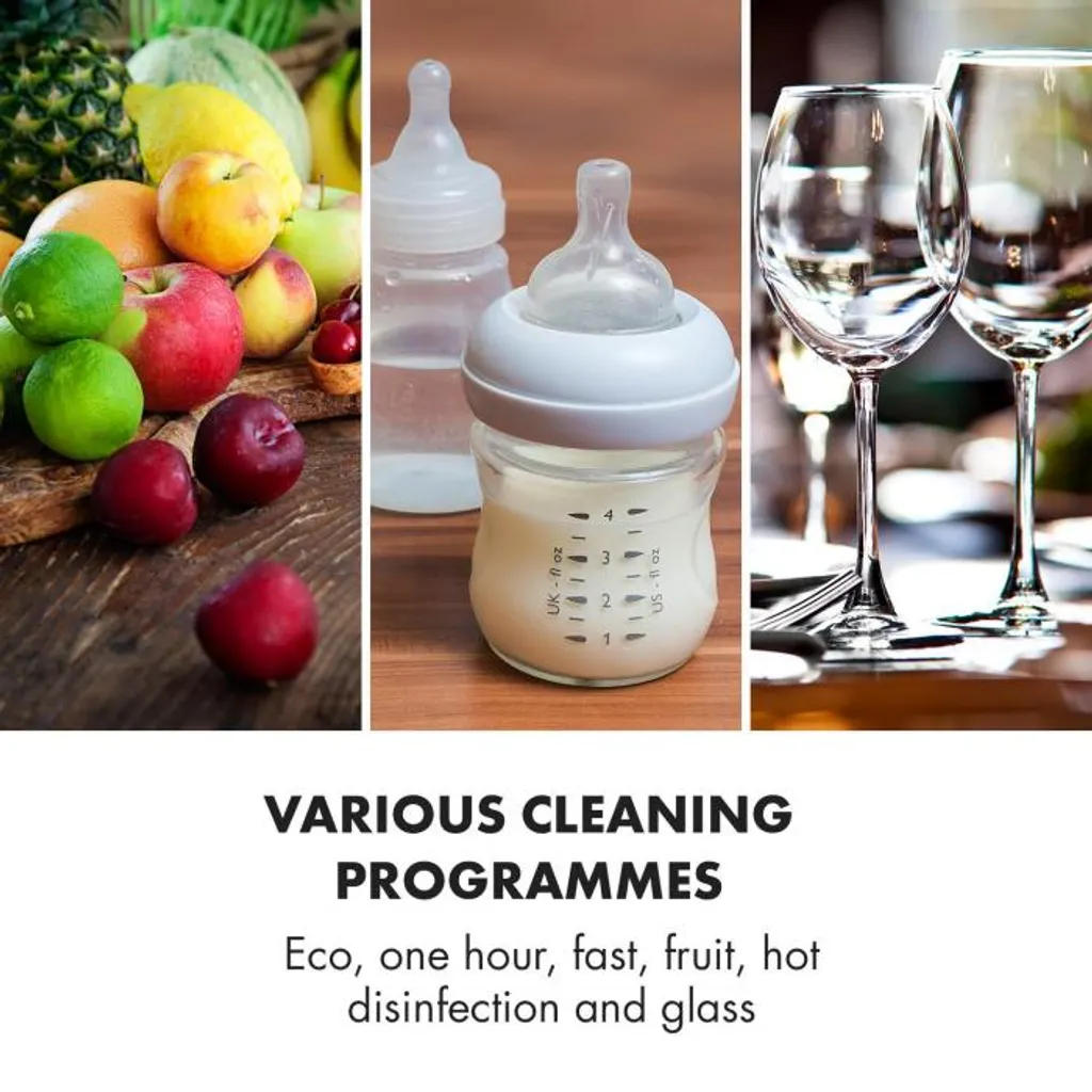 – Sechs verschiedene Programme: Eco, Eine Stunde, Schnell, Obst, Heißdesinfektion und