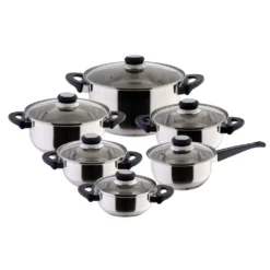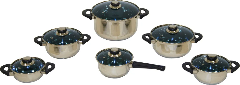 - .6-teiliges Set bestehend aus 5 Kochtöpfen in unterschiedlichen Größen und 1 Stieltopf, sämtliche Töpfe inklusive Deckel – geeignet für alle Herdarten außer Induktion