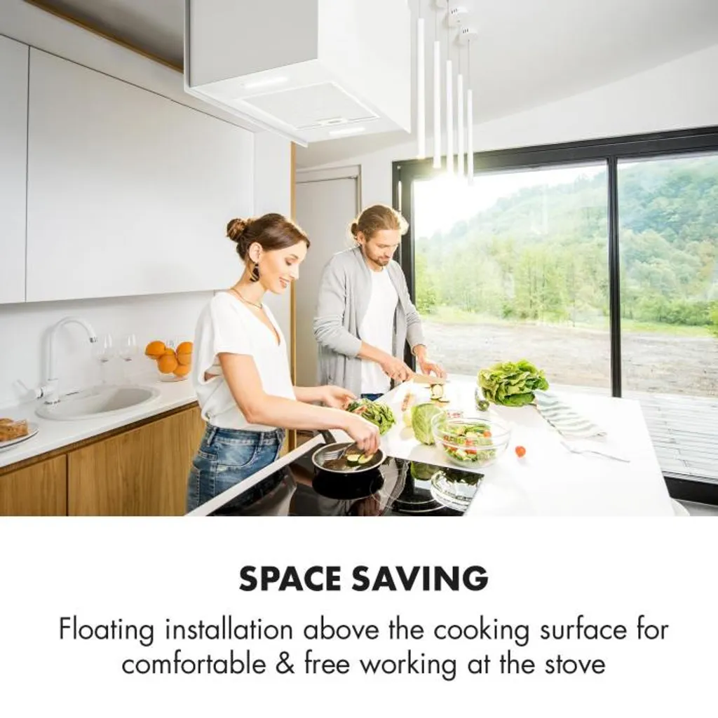 Leuchtende Eleganz: Die Klarstein Kronleuchter L Inselabzugshaube bringt Glanz in die Küche und befreit die Luft von Dampf und Dunst.