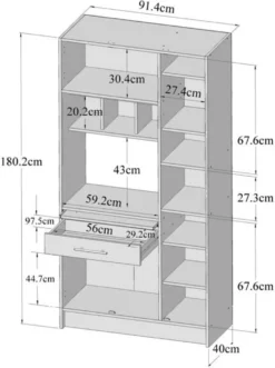 - Aufbau: 5 Türen, 1 Arbeitsplatte zum Herausziehen, 4 Ablageflächen, 1 Schublade, 1 Fach für die Mikrowelle
