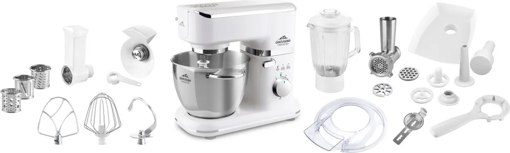 ETA GRATUSSINO MAXO II – Planeten – Rührwerk System. Reiches Zubehör für perfektes Kneten von Teig oder Mahlen von Fleisch. Leistungsfähiger 1000 W Motor mit dem Stabilisator.