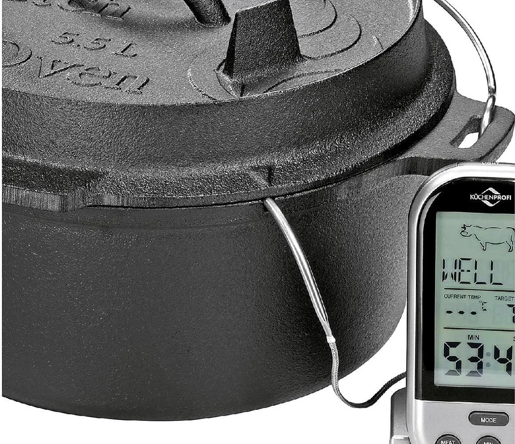 Nur im Sommer ist Grillzeit? Mit dem Dutch Oven BBQ von Küchenprofi werden auch kühle Herbstabende und kalte Wintertage zum kulinarischen Ereignis in der Natur. Eine Thermoskanne mit Heißgetränk und ein wärmendes Lagerfeuer mit dem Gusseisentopf, in dem ein leckerer Eintopf, deftiges Gulasch oder das berühmte Schichtfleisch schmurgelt – Genuss pur mit Freunden und Familie. Vielleicht möchtest Du auf dem Grill ein frisches Brot backen oder gesundes Gemüse garen in der Feuerschale? Durch eine praktische Öffnung am Rand des Topfes kann ein Thermometer geführt werden, damit Du die Kerntemperatur Deiner Leckereien gut im Auge behalten kannst. Der Deckel ist optimal geformt, um Briketts für die Oberhitze zu halten und kann zusätzlich als eigenständige Form genutzt werden. Aber natürlich macht der Dutch Oven auch in der Küche eine gute Figur. Für alle Herdarten geeignet, bietet er sämtliche Vorteile beliebter Gusseisentöpfen.