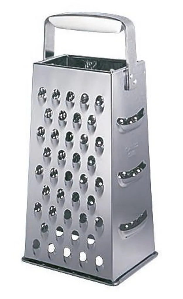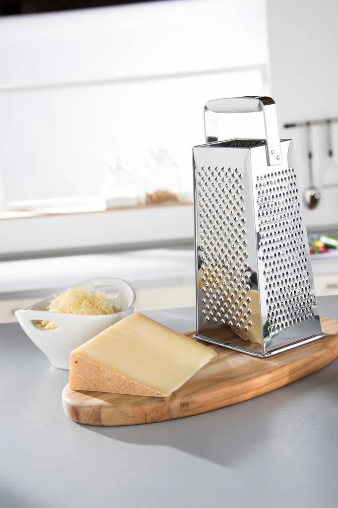 Diese Vierkantreibe ist ein praktisches Allroundtalent zum Reiben, Raspeln und Hobeln. Die Reibe besitzt eine feine und grobe Reibfläche. In dieser Küchenreibe befindet sich ein Kroneneinsatz und ein Scheibenschneider in einem.
