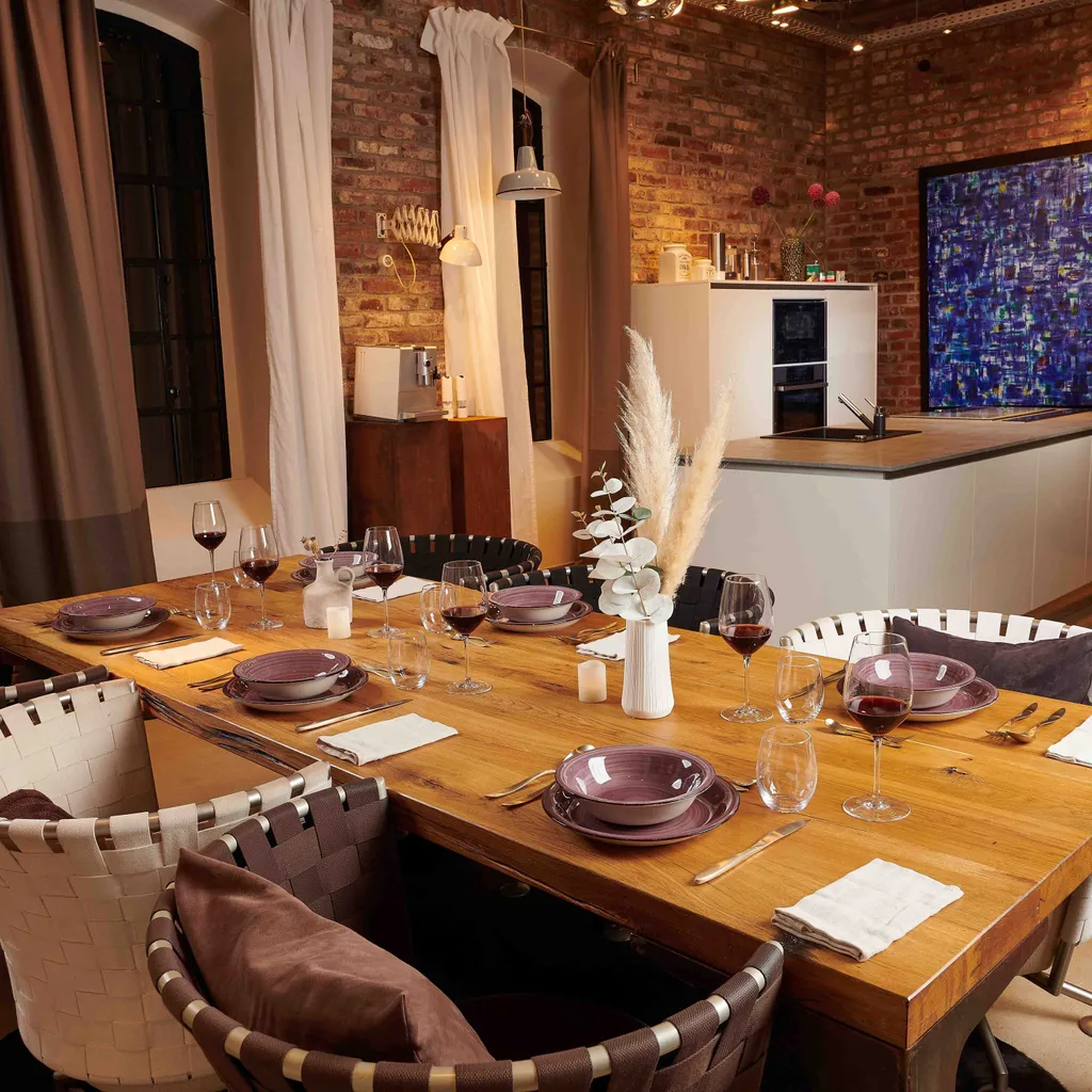 - Dieses moderne, rustikal anmutende Geschirrset besteht aus 6x Speiseteller, 6x Suppenteller, 6x Dessertteller, 6x Müslischale und 6x Kaffeebecher (390 ml) in der Farbe Berry (zwischen Weinrot und Rosine)
