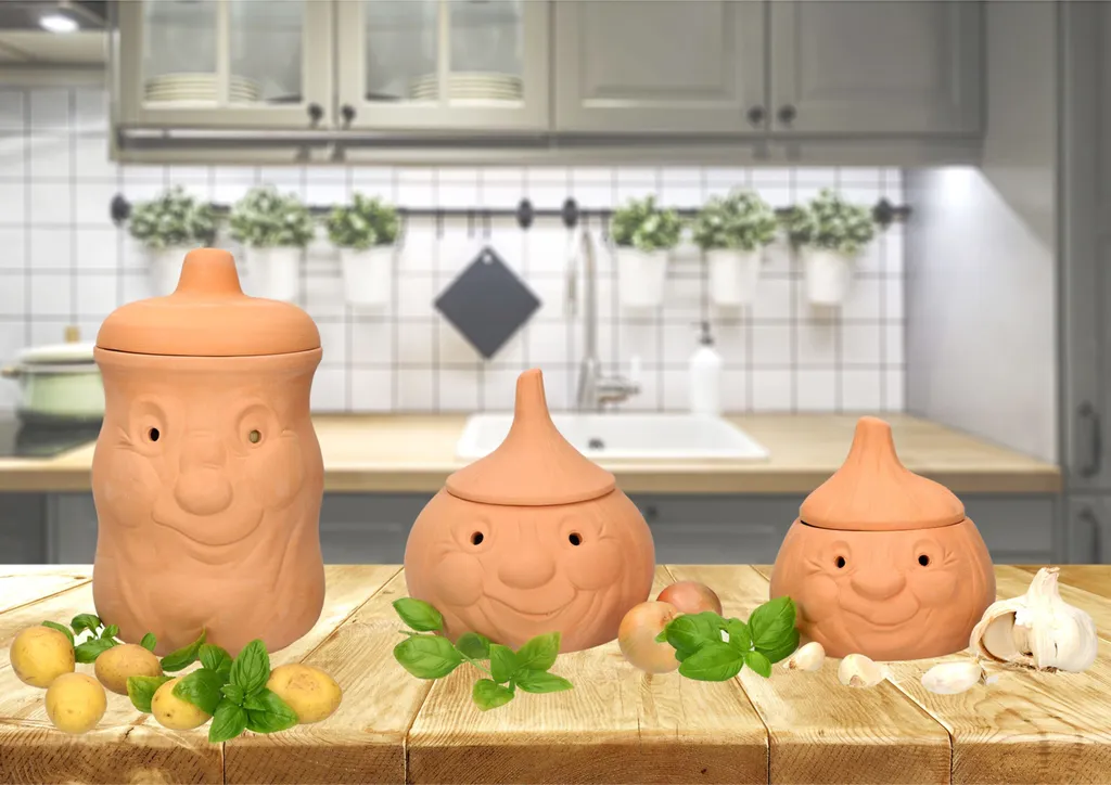 Super schöne Aufbewahrungsbehälter für die optimale Lagerung von Lauch- und Knollengemüse. Die witzigen Gefäße mit lächelndem Gesicht schützen Ihre Lebensmittel vor Licht und Feuchtigkeit. Die runden Gemüseköpfe bestehen aus echter Terrakotta und unterscheiden sich in Optik und Größe. Jeder Behälter wird inkl. Deckel und einzeln verpackt, im tollen Geschenkkarton geliefert. Nutzen Sie das Etikett für den Beschenkten.
