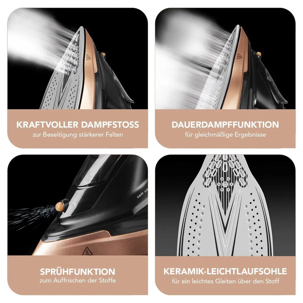 - Dauerdampffunktion für gleichmäßige Ergebnisse und kraftvoller Dampfstoß zur Beseitigung stärkerer Falten