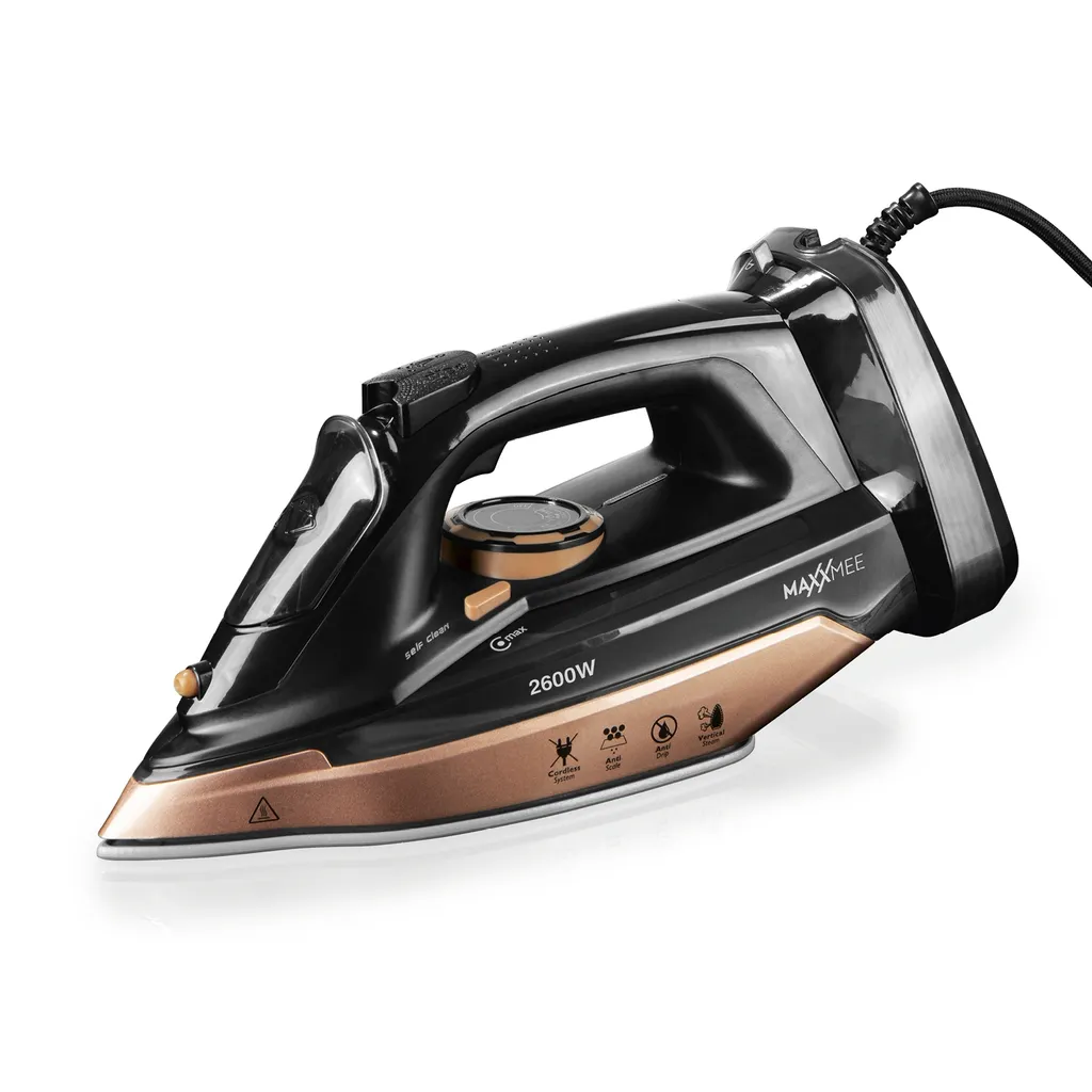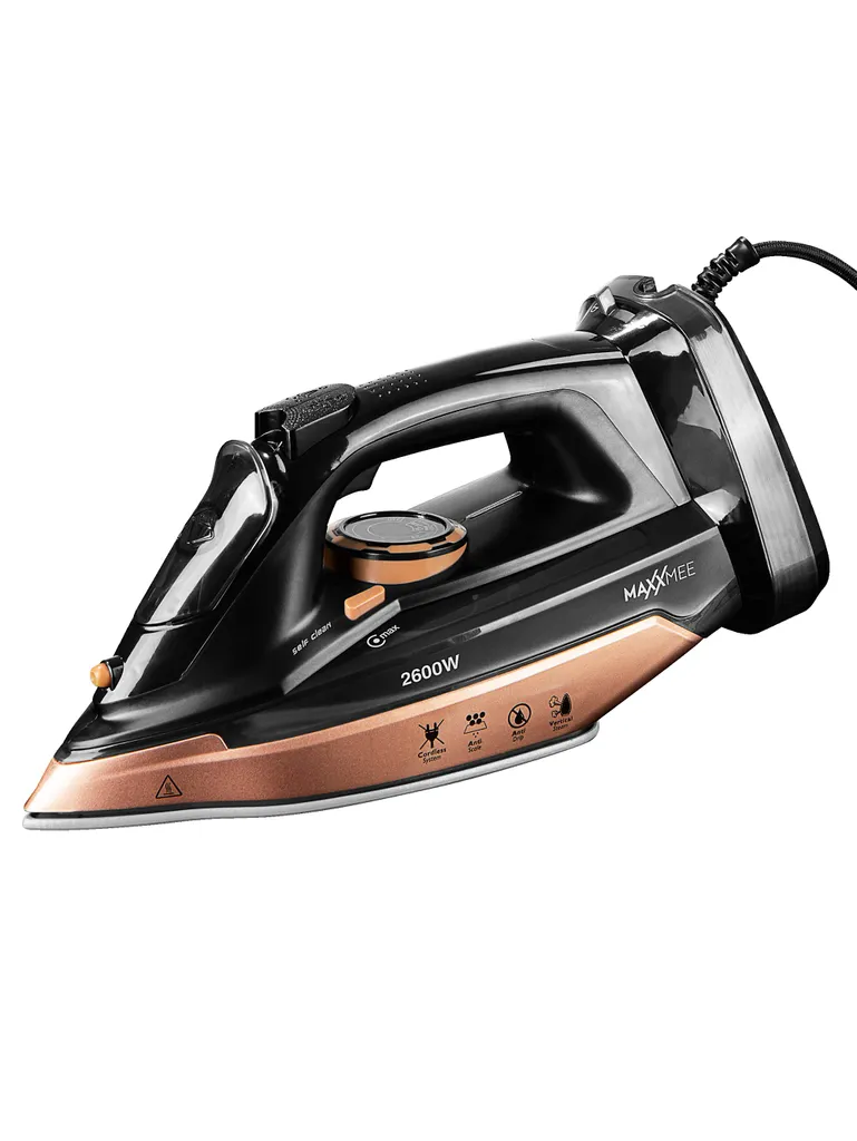 MAXXMEE Kabelloses 2in1 Dampfbügeleisen. Für maximale Bewegungsfreiheit ist dieses Gerät mit und ohne Kabel einsetzbar. Kabelloser Bedienkomfort – einfach das Bügeleisen entriegeln und von der Basis-Ladestation trennen. Das leistungsstarke Dampfbügeleisen verfügt über eine Sprühfunktion gegen hartnäckige Falten und eine individuelle Dampf- und Temperaturregulierung. Mit kraftvollem Dauerdampf oder Dampfstoß – auch zum vertikalen Bedampfen und Auffrischen von hängenden Textilien oder Vorhängen. Kratzfeste Keramik-Bügelsohle für sanftes Gleiten ohne Anhaften, auch für empfindliche Textilien geeignet. Mit Überhitzungsschutz, Selbstreinigungsfunktion, Anti-Kalk- und Anti-Tropf-Schutz. Leicht nachfüllbarer Wassertank (300 ml). Inklusive Messbecher. 2600 Watt (max.). Maße inkl. Basis LxBxH ca.: 33 x 16 x 17 cm.