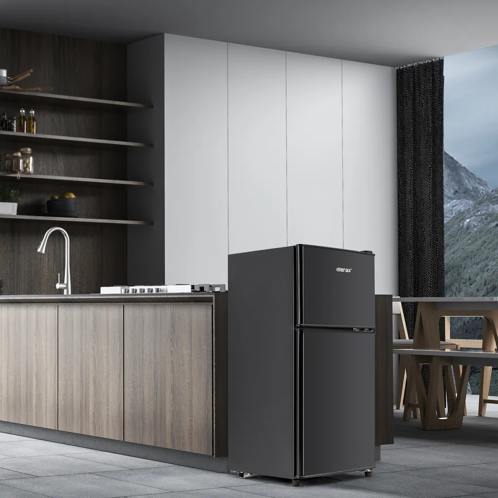 - Das kompakte Außendesign dieses schwarzen Doppeltür-Kühlschranks bringt eine modische und coole Atmosphäre in Ihr Zuhause.