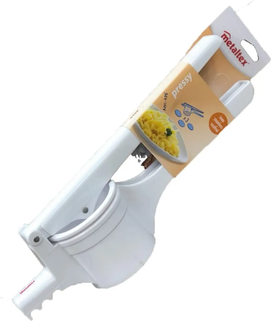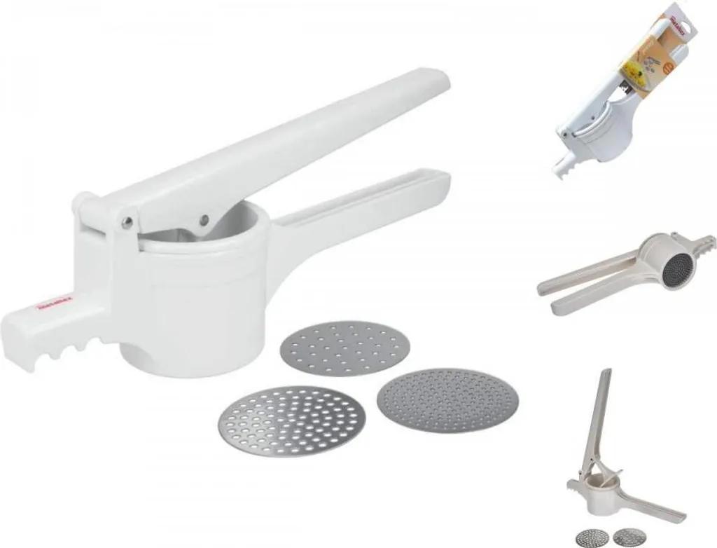 kartoffelpresse 3 edelstahlscheiben abmessungen: 36cm (tiefe) metaltex. körper aus abs kunststoff. stabil und handlich, leicht zu reinigen. besonders geeignet für kartoffelpüree, spätzle, gnocchis und obst.