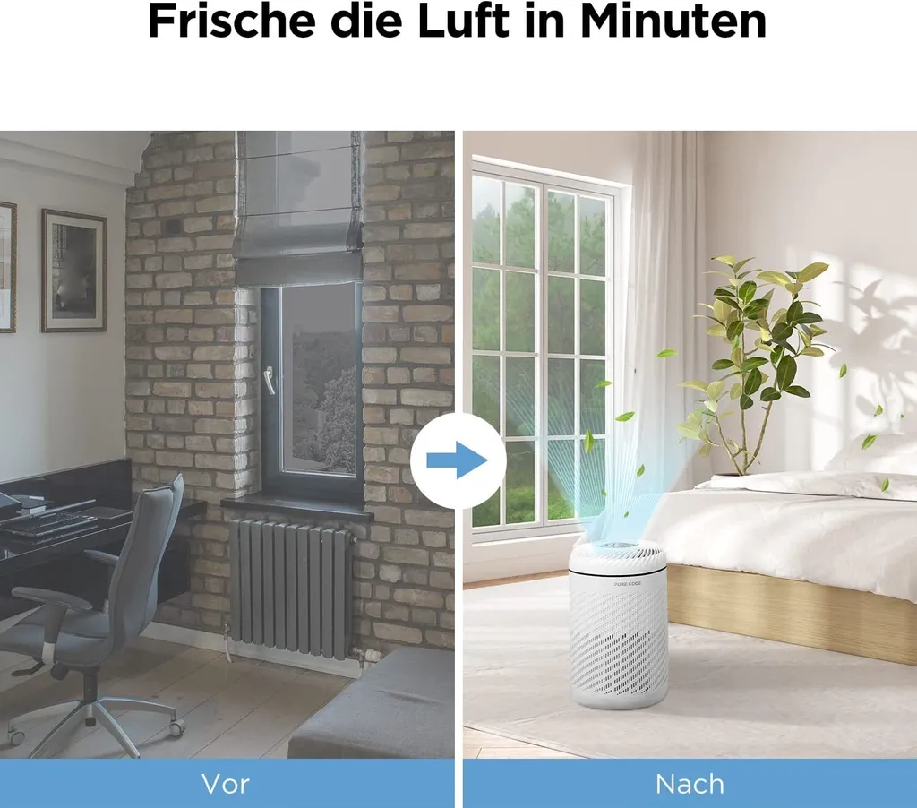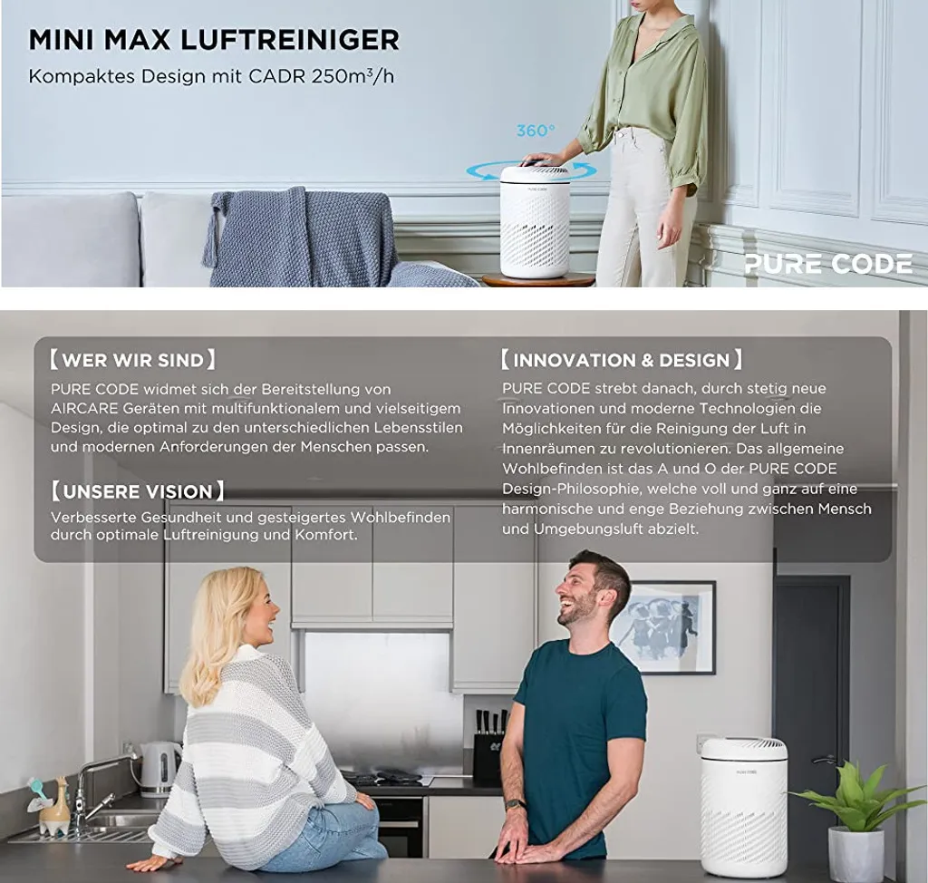 - KOMPAKT UND LEISTUNGSSTARK: Dank des höchst effektiven CADR-Werts von 250m³/h benötigt der MINI MAX nur 10 Minuten, um im Turbo-Modus die Luft in Räumen von bis zu 35m² (350 ft²) zu erfrischen. Die Luft zirkuliert 3-5 Mal pro Stunde. Geeignet für Allergiker, Asthmatiker oder Menschen mit Atemwegserkrankungen. Dank der kompakten Größe passt das Gerät über all in Ihre Wohnung; Sie können es ganz einfach umstellen und z.B. auf einen Schreibtisch oder Nachttisch stellen.