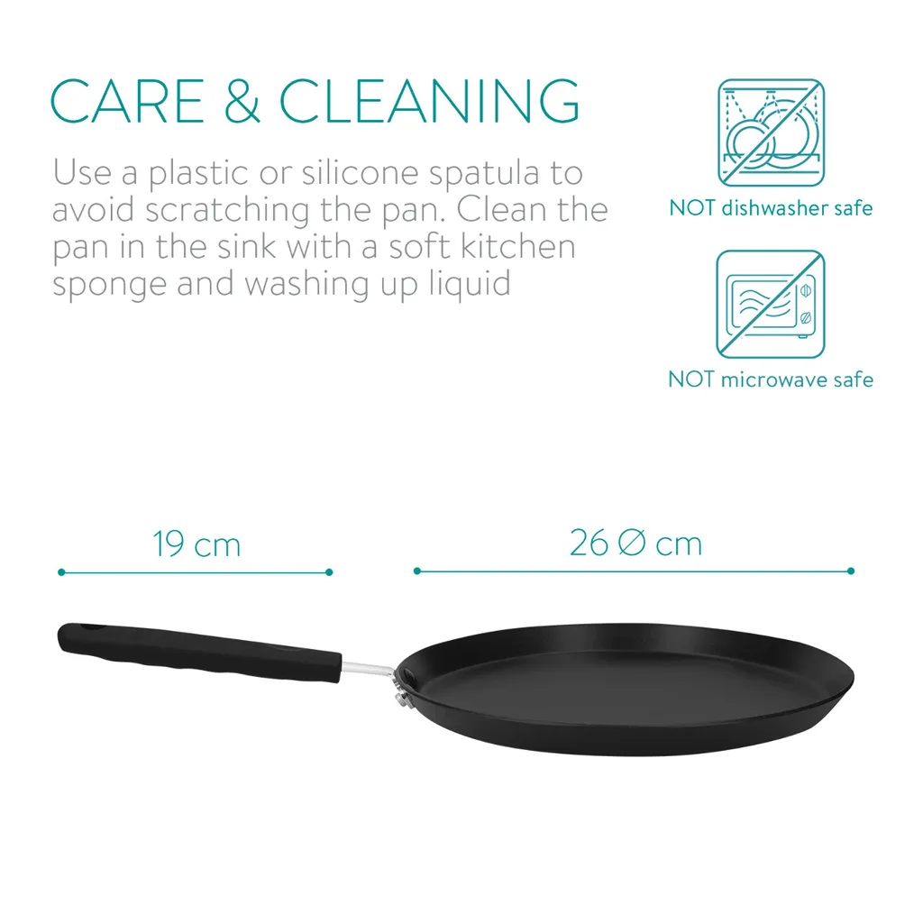 Die Crepepfanne ist flach und hat einen Durchmesser von 26 cm. So kann der eingefüllte Crepe leicht gedreht werden. Nach Benutzung kann die Pfanne dank des Lochs im Griff platzsparend an die Wand gehangen werden.