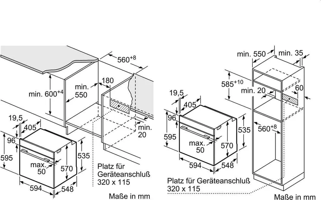 - (Mindest-)Höhe des Installationsgehäuses des Ofens: