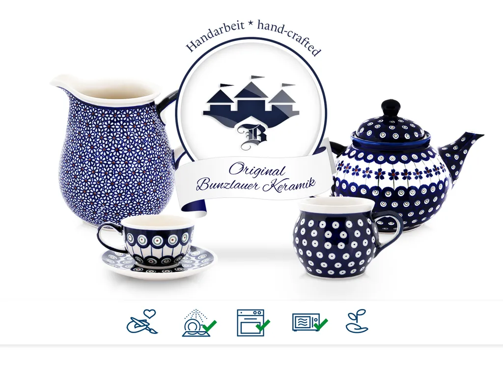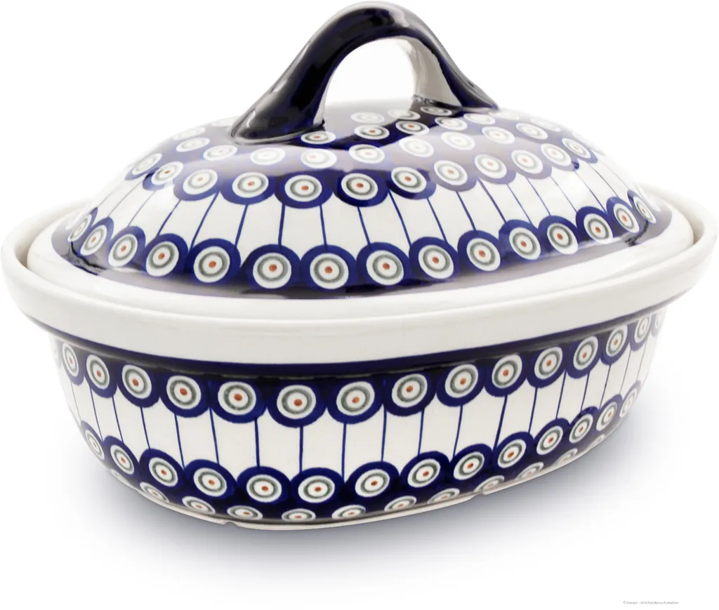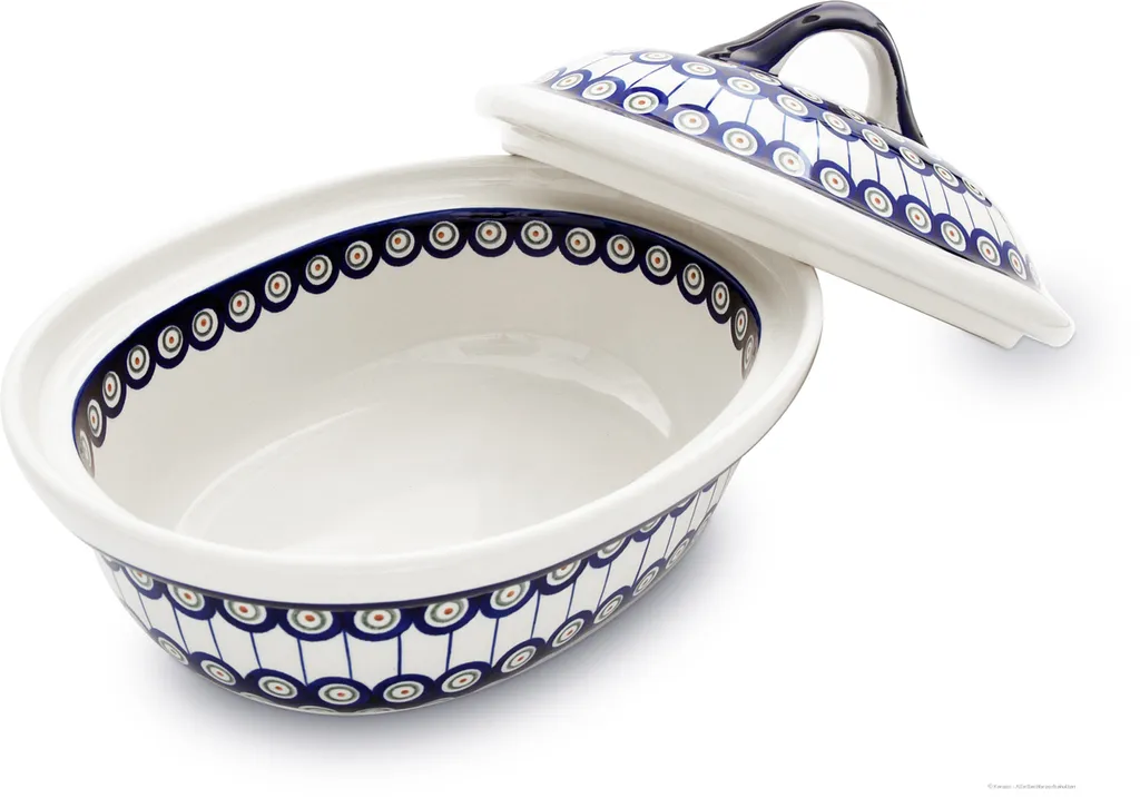 Viele kleine Details schmücken den großen Bräter mit passendem Deckel. Das Modell eignet sich für Haushalte mit 3 bis 4 Personen, da es ein Volumen von 2,2 Litern ausweist. Die Maße betragen 25,5×31,8×19,2 Zentimeter. Der Bräter besteht aus Bunzlauer Keramik.