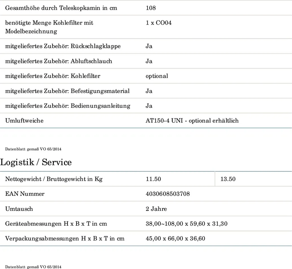 Gesamthöhe durch Teleskopkamin: 108,00 cm
