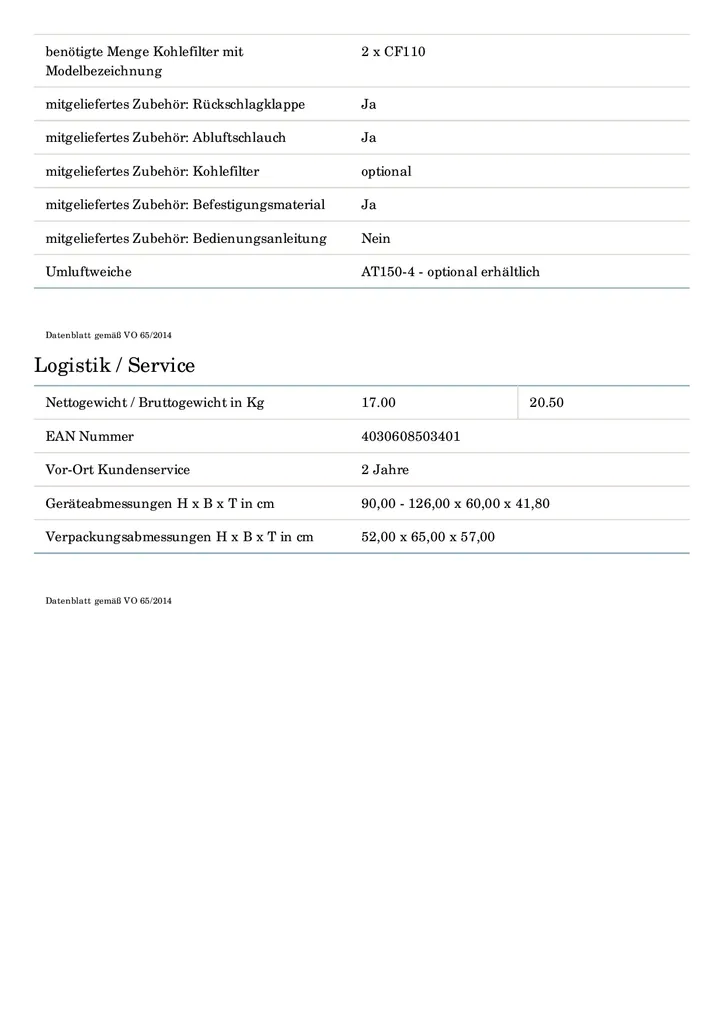 - A-bewertete Luftschallemission im Betrieb auf der Intensivstufe oder Schnelllaufstufe: – dB