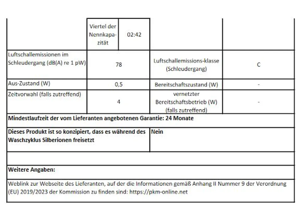 - Geräuschwert Schleudern im Standardprogramms Baumwolle 60 °C bei vollständiger Befüllung: 76 dB(A) re 1 pW