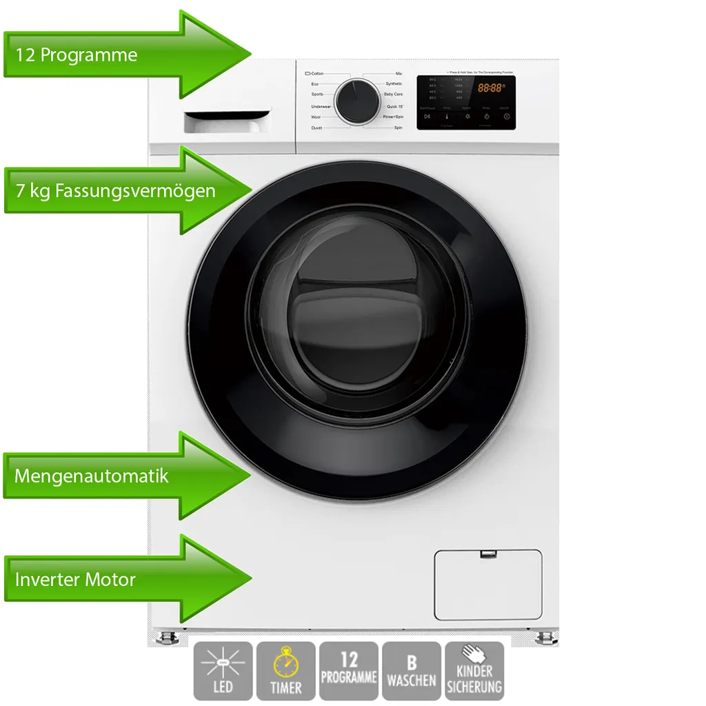 Edelstahl, (A-G), Fassungsvermögen 7,00 kg, Steuerung Elektronisch, Schleuderwirkungs, maximale Schleuderdrehzahl 1400 U/Min, Kindersicherung, Startzeitvorwahl, Mengenautomatik