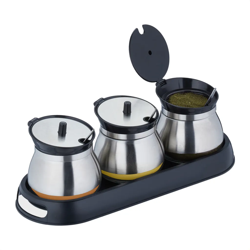 Dieses 3er Gewürzdosen-Set mit praktischem Tablett eignet sich wunderbar für die Küche oder den gedeckten Tisch. Ob für klassische Gewürze zum Abschmecken von Speisen, für Zucker an der Kaffee- und Teestation oder für Parmesan, Chutneys und mehr – die Würzbehälter können äußerst vielfältig zum Einsatz kommen. Mit den kleinen Löffeln lassen sich die Gewürze einfach entnehmen und dosieren, anschließend können die Gewürzschälchen mithilfe der Deckel wieder verschlossen werden.