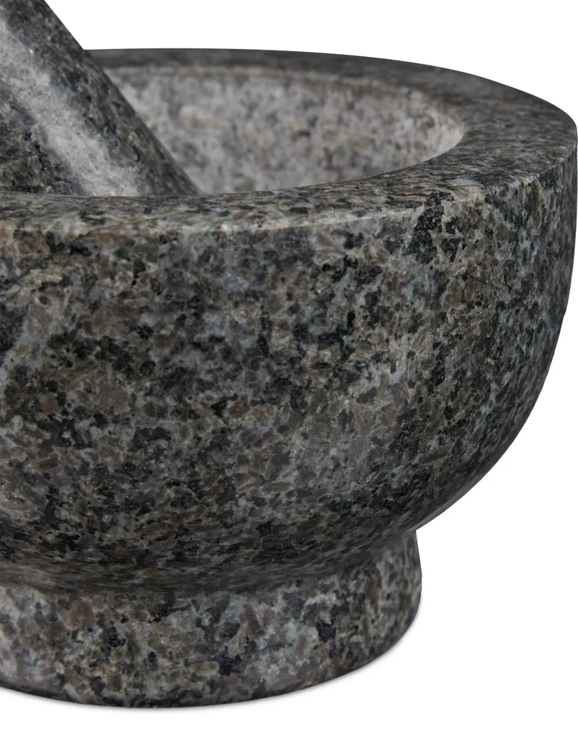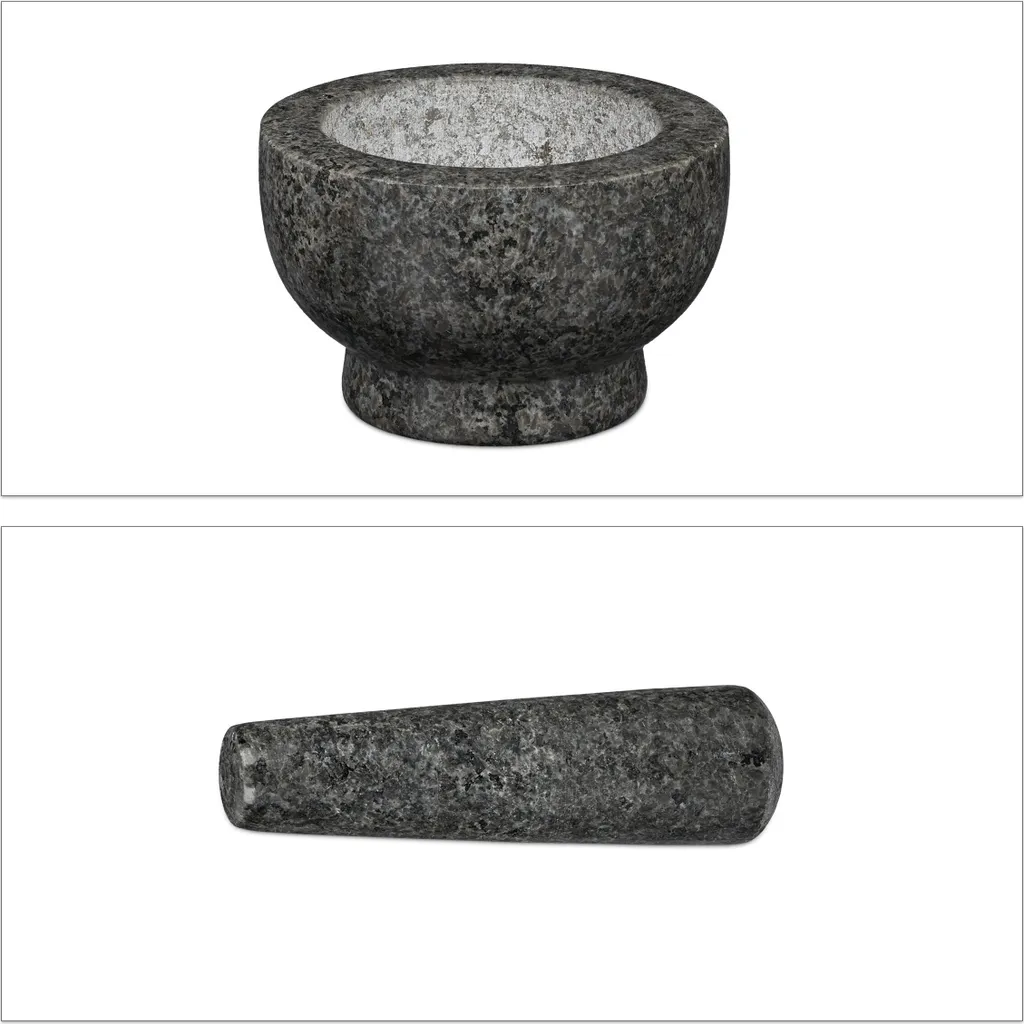 Leckere Saucen, Pestos und Pasten selber zubereiten – der Granit Mörser mit Stößel macht es möglich. Der harte Naturstein eignet sich für das aromatische Zerkleinern von Gewürzen, Kräutern und Nüssen. Die Innenfläche und das Stößel Ende sind angeraut und sorgen somit für ein besonders effizientes Mahlergebnis. Die polierte Oberfläche macht aus dem Steinmörser einen stylischen und essentiellen Küchenhelfer. Auch für die Fertigung von Salben und anderen Hausmitteln eignet sich der Mörser.