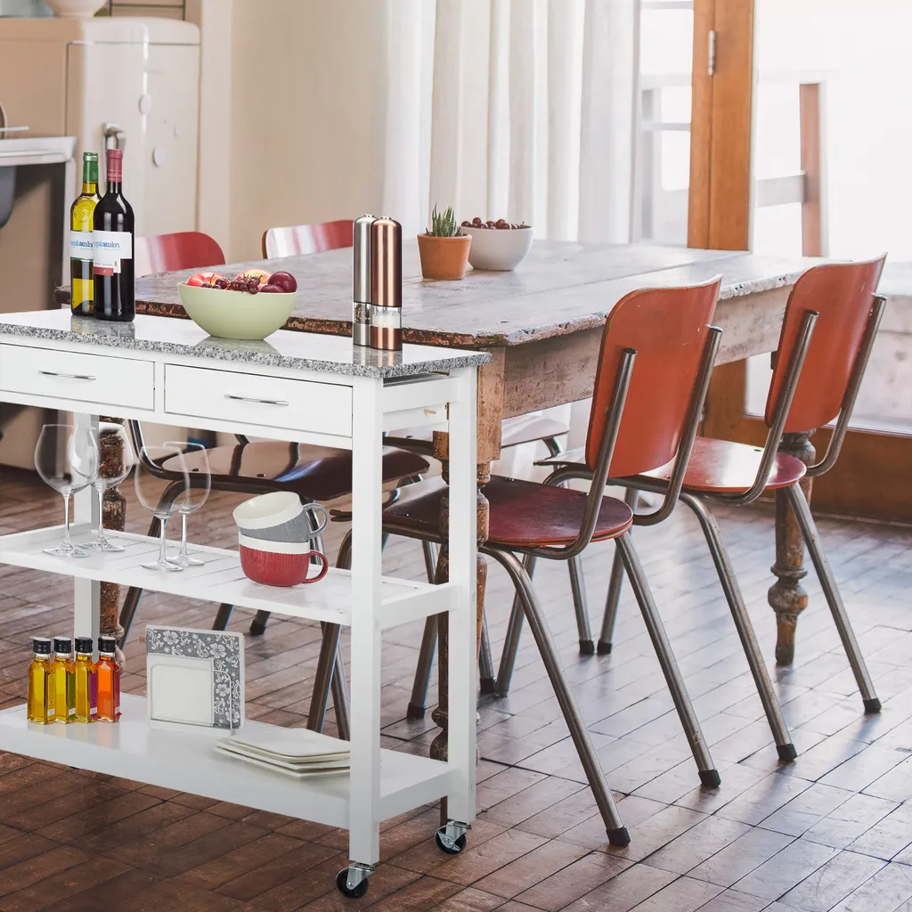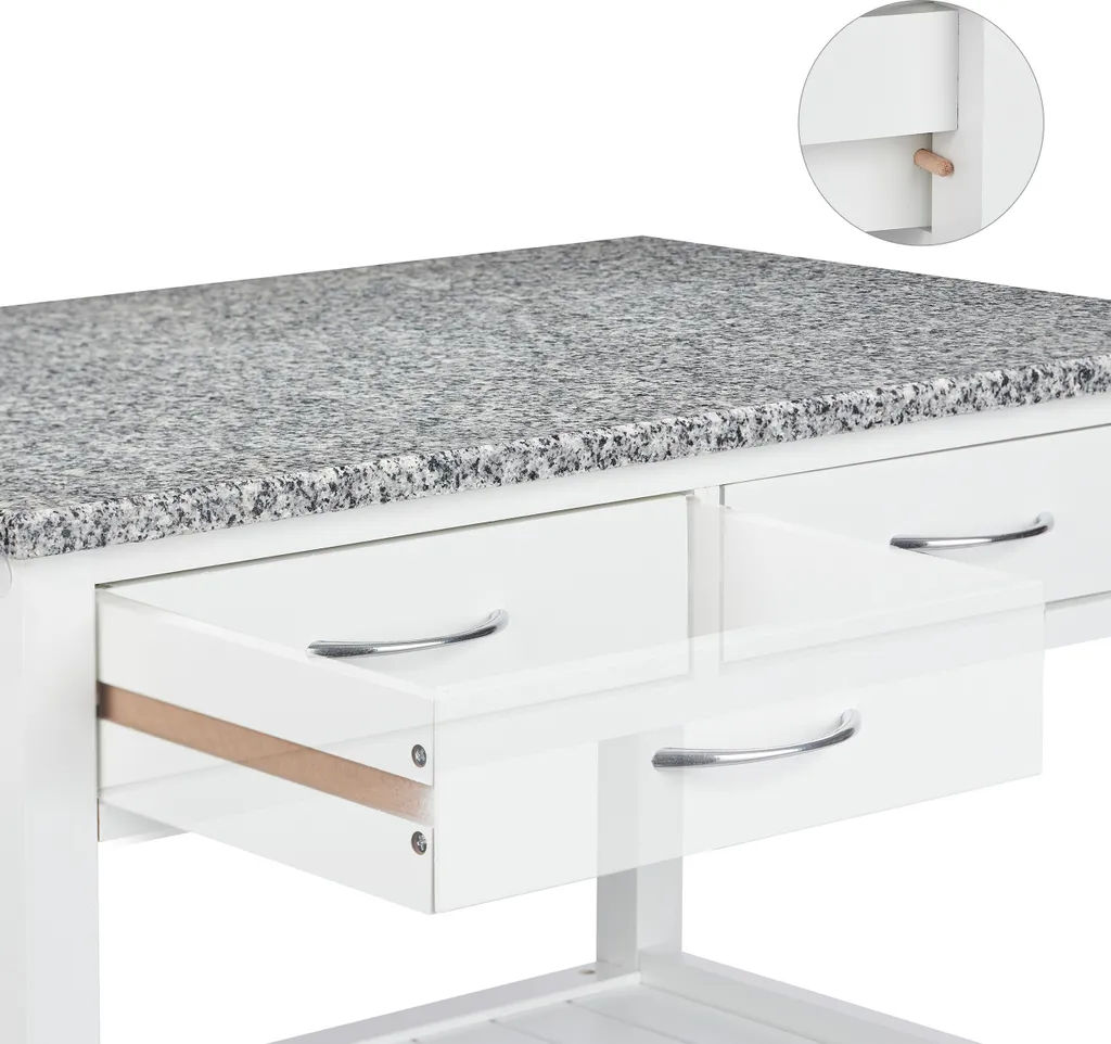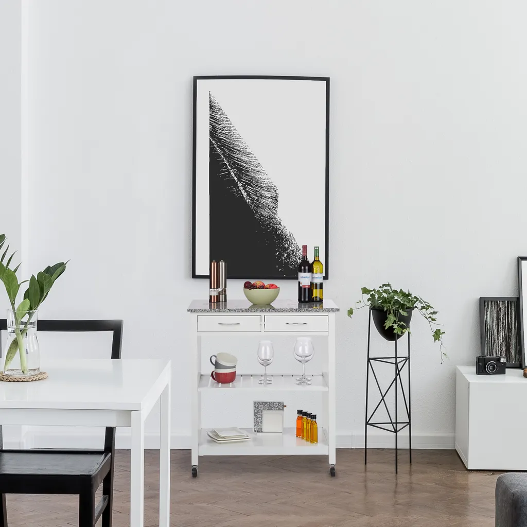 Sie möchten leckere Gerichte oder einen guten Tropfen nicht nur in der Küche oder im Wohnzimmer zu sich nehmen, sondern einfach da, wo es gerade am schönsten ist? Dann ist der weiße Küchenwagen der richtige Mitstreiter für Ihren Haushalt. Die Gelenke der Rollen lassen sich in jede gewünschte Richtung drehen, sodass nichts die Mobilität des Servierwagens einschränkt. Die große Arbeitsplatte aus Granit macht sofort Lust aufs Kochen. Für Geschirr, Besteck oder Flaschen steht jede Menge Stauraum auf 3 Ebenen zur Verfügung.