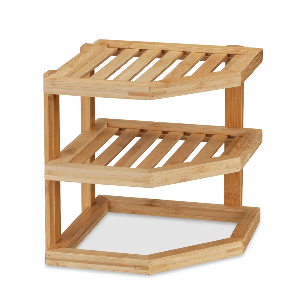 Mit dem platzsparenden Küchenregal schaffst Du wertvollen Stauraum und bringst Ordnung ins Küchenchaos. Der Regaleinsatz bietet auf 2 Ablagen Platz für Gewürzgläser, Ölfläschchen, Teller und mehr. Der freistehende Eckschrankeinsatz ist flexibel im Küchenschrank oder auf der Arbeitsplatte platzierbar. Dank der Fertigung aus Bambus mit toller Maserung bringt der Tellerstapler ein Stück Natürlichkeit in Deine Küche.