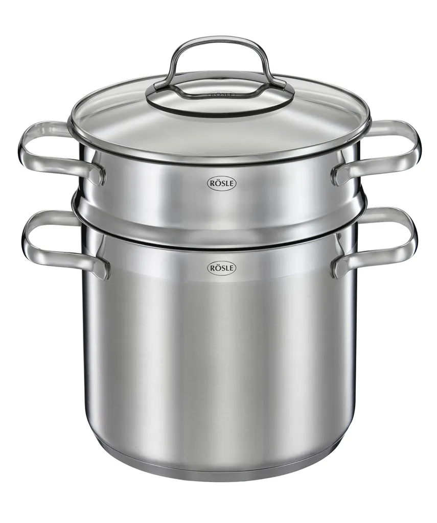 Der Rösle Nudeltopf hat einen extra tiefen Pastaeinsatz mit dem sich Penne, Fussili, Spaghetti oder auch Gemüse gleichmäßig al dente kochen lassen. Der herausnehmbare Edelstahleinsatz ist auch als Sieb zum Abgießen nutzbar. Der Pastaeinsatz wird einfach zwischen den Topf und den Deckel eingesetzt. Der Pastatopf hat zudem eine praktische Innenskalierung und ist spülmaschinenfest.