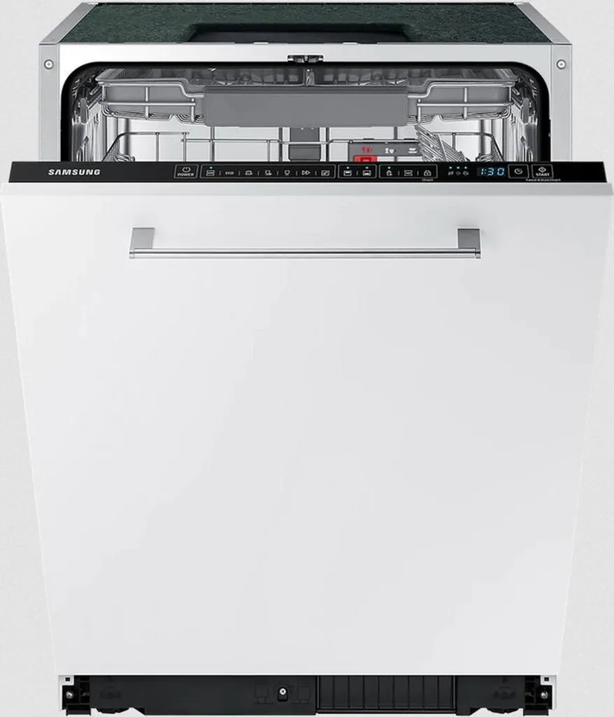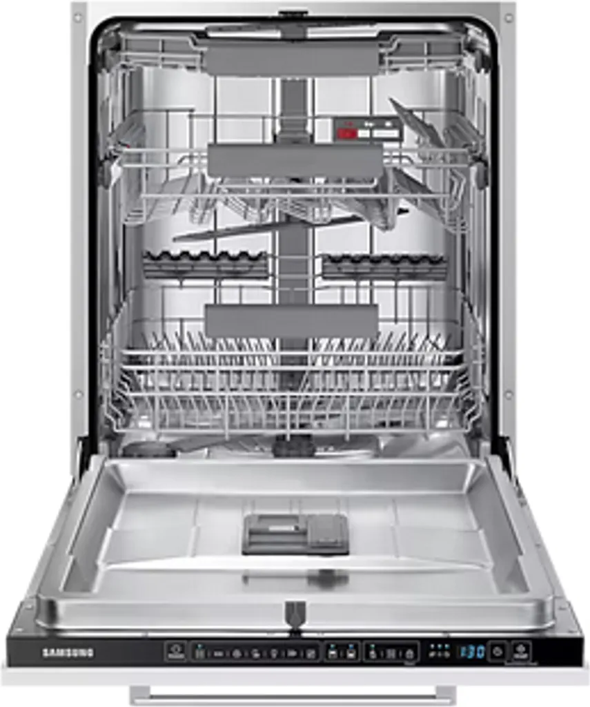 Samsung Einbau Geschirrspüler (vollintegriert), Besteckschublade, 60 cm DW60A6092IB/ET Automatische Türöffnung Lautstärke: 44 dB(A) Hygiene-Funktion ExpressWash 60 Min. Edelstahl-Bottich Aquastop Glänzend saubere Effizienz Sei mit der Samsung Spülmaschine zeit- und energieffizient, während sie Geschirr in verschiedenen Größen überzeugend reinigen kann. Die Körbe lassen sich sanft hinaus- und hereinfahren und können flexibel verstellt werden, sodass du verschiedenes Kochgeschirr unterbringen kannst – und nach dem Spülgang öffnet sich der Geschirrspüler von alleine. Einfach komfortabel Soft Railing Dank Soft Railing kannst du die vollen Körbe nach dem Spülgang sicher und leicht herausziehen. Hierbei wird ein kugelgelagertes Schienensystem mit weniger Reibung genutzt, so dass sich die Körbe mit geringem Kraftaufwand hinein- und herausziehen lassen – auch mit schweren Pfannen. Und da es beim Herausziehen wenig wackelt, fällt auch selten Geschirr heraus. Flexible Beladung Reinige…