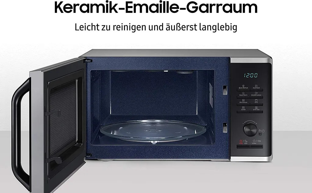 Samsung MG23K3515AS/EG. Geräteplatzierung: Arbeitsfläche, Produkttyp: Grill-Mikrowelle, Innenkapazität: 23 l. Anschlusswert: 1100 W, AC Eingangsspannung: 230 V, AC Eingangsfrequenz: 50 Hz. Breite: 489 mm, Tiefe: 392 mm, Höhe: 275 mm