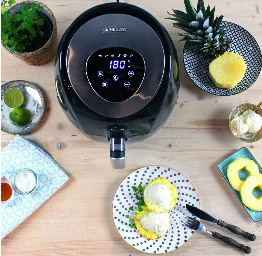 Diese Heißluftfritteuse sorgt für ein fettfreies Frittieren, Garen, Braten & Backen ohne die Zugabe von Fett oder Öl.