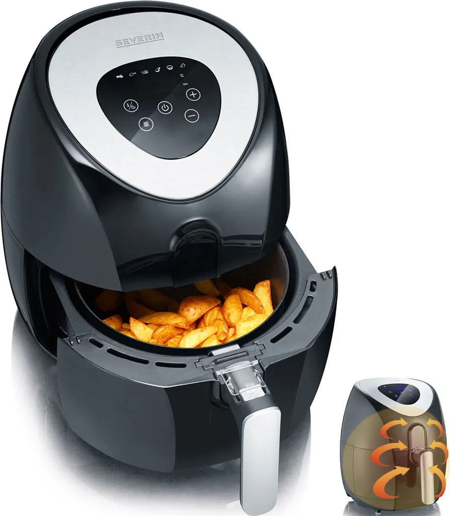 Severin Heißluftfritteuse FR 2430. Kapazität Frittierkorb: ca. 3,2 Liter, Überhitzungsschutz, Betriebskontrollleuchte, Bereitschaftsanzeige, einstellbare Temperaturregel von 80 bis 200°C, intuitives LCD Touch-Display für eine schnelle und einfache Bedienung. Innovative Heißluft-Technologie. Energiesparend, schnell & geruchsfrei. 6 Automatik-Programme. 60 Minuten Timer mit Signalton.