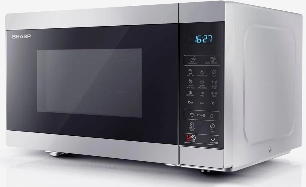 Großzügiges Mikrowellengerät von SHARP in zeitlosem Design: Ob Auftauen, Erwärmen, Grillen oder Garen, das Gerät eignet sich ideal für schmackhafte Fleisch- und Fischgerichte, Gemüse oder das Zubereiten von Popcorn.