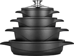 Dieses schöne Kochgeschirrset der Marke Smile wertet jede Küche auf. Die Pfannen sind für jedes Kochfeld geeignet, einschließlich Induktions-, Gas- und Elektroherd. Auch wenn Sie Ihre Wohnung oder Küche wechseln, können Sie diese Pfannen weiterhin verwenden. Das schwarze Material und die Glasdeckel sorgen für ein s und stilvolles Aussehen, ganz gleich, welche Farbe Ihre Küche hat. Neben dem schönen Aussehen sind die Pfannen auch qualitativ hochwertig; sie haben alle eine Antihaftbeschichtung, Edelstahlknöpfe und dicke Wände für eine gleichmäßige Wärmeverteilung. Das perfekte Pfannenset zum Kochen, Frittieren, Schmoren oder Braten.