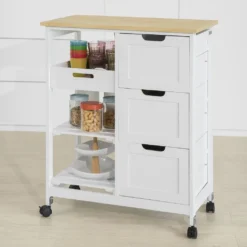 Ausgestattet ist dieser praktische Küchenwagen mit drei großen Schubladen und drei offenen Ablagen, in denen Sie viele Utensilien verstauen können.