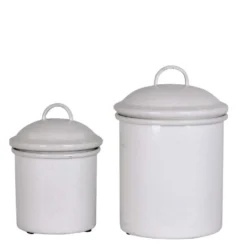 Sie bereichert mit ihrer lieblichen Optik das Regal oder die Küchenzeile, sehen auf dem Esstisch richtig dekorativ aus und sind dir als Ordnungshüter auch im Hobbyraum oder im Bad gerne behilflich. Die Blechdosen Ingrid kommen im 2er Set, einmal in der Größe Ø 10 x H 15 cm und einmal in der Größe Ø 8 x H 11 cm. Sie sind von Hand bemalt, haben eine marmorierte Oberfläche und eine Deckel mit praktischem Griff. Jedes Dose ist einzigartig.