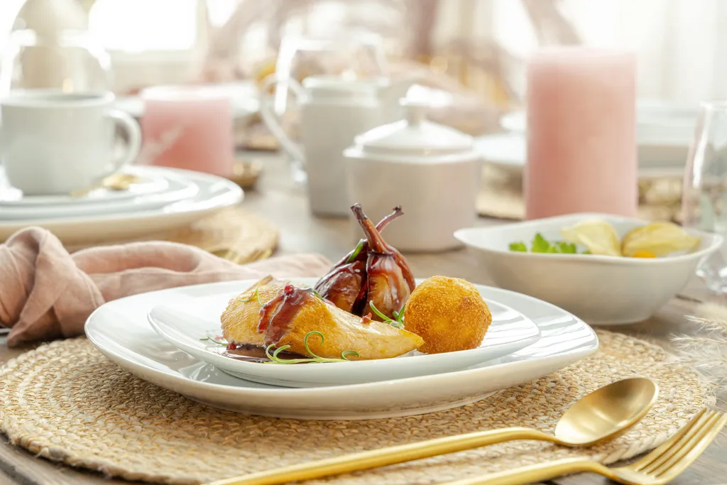 Das ist das Highlight dieses Tellersets. Die Runde, leicht eckige Form ist universell einsetzbar und lenkt nicht vom Essen ab.