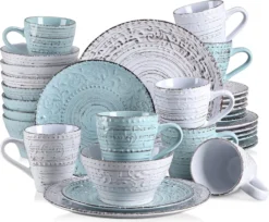 - Nature Farben Elemente. Das Essgeschirrservice Set enhält zwei Naturfarben – Beige und Blaugrün. Einfach zu erinnern an die Natur Elemente wie Meer und Sand, was Ihnen eine stilvollen Eleganz und bequeme Erfahrung verleiht. Die einzigartige blaue Farbanstimmung errinnen sich einfach an blauen Ozean, wunderschöne Muschel und angenehmen weißen Sand!