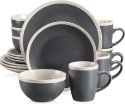 - Individuelles modernes Design. Aus hochwertigem und umweltfreundlichem Steingut ist das Geschirrset von Hand gefertigt. Einzigartige schwarze Sesam Oberfläche, ungewöhnliche weiße Kante, wunderschönes mattes Design, vielfältige Farbungen und stilvolle moderne Optik entsteht eine angenehme Harmonie, was Ihren Tisch etwas schick machen;