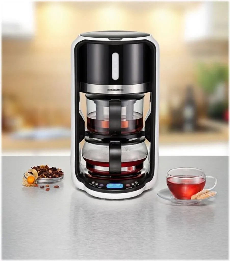 Ein elegantes Gerät, das durch hochwertige Verarbeitung und durchdachte Technik überzeugt. Dank elektronischer Steuerung lassen sich 4 unterschiedliche Brühtemperaturen und die individuelle Ziehzeit entsprechend der jeweils verwendeten Teesorte einstellen. Ob Schwarztee, Grüner oder Weißer Tee, ob Tees aus Früchten oder Kräutern – dieser Vollautomat liefert aromatische Ergebnisse für jeden Geschmack. Perfektes Teekochen wird leicht gemacht: Wasser einfüllen, Teesieb befüllen, Programm je nach Teesorte wählen und – falls gewünscht – die Ziehzeit anpassen, alles Weitere erledigt der Tee Automat. Das Wasser wird erhitzt und in die Filterkanne zum Tee geleitet. Ist die eingestellte Ziehzeit abgelaufen, fließt der gebrühte Tee in die formschöne Glaskanne und wird dort warm gehalten. Auch anspruchsvolle Teetrinker werden dieses Gerät aus dem Hause Rommelsbacher lieben!