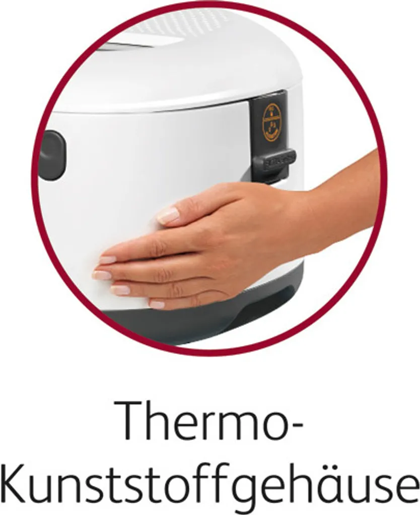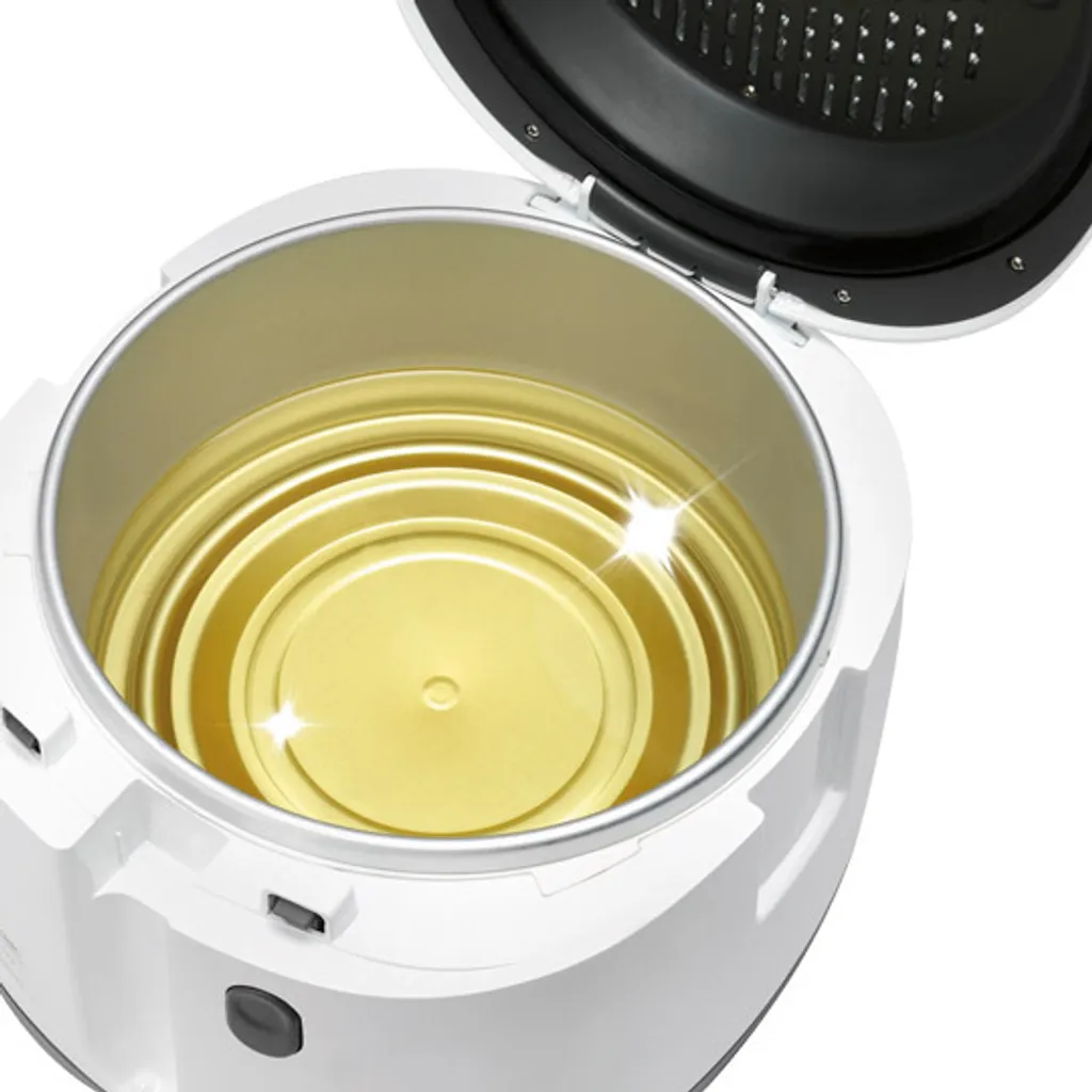 Clean-Oil-System: Das extra feine Auffangsieb filtert Frittierreste aus dem Öl Automatische Deckelöffnung Deckel, Frittierkorb und Filtersieb spülmaschinengeeignet Griff am Gehäuse wegklappbar Regelbarer Thermostat mit Temperaturkontrollleuchte Ein- / Ausschalter Thermowand mit 2 Griffen Farbe: Weiß / anthrazit