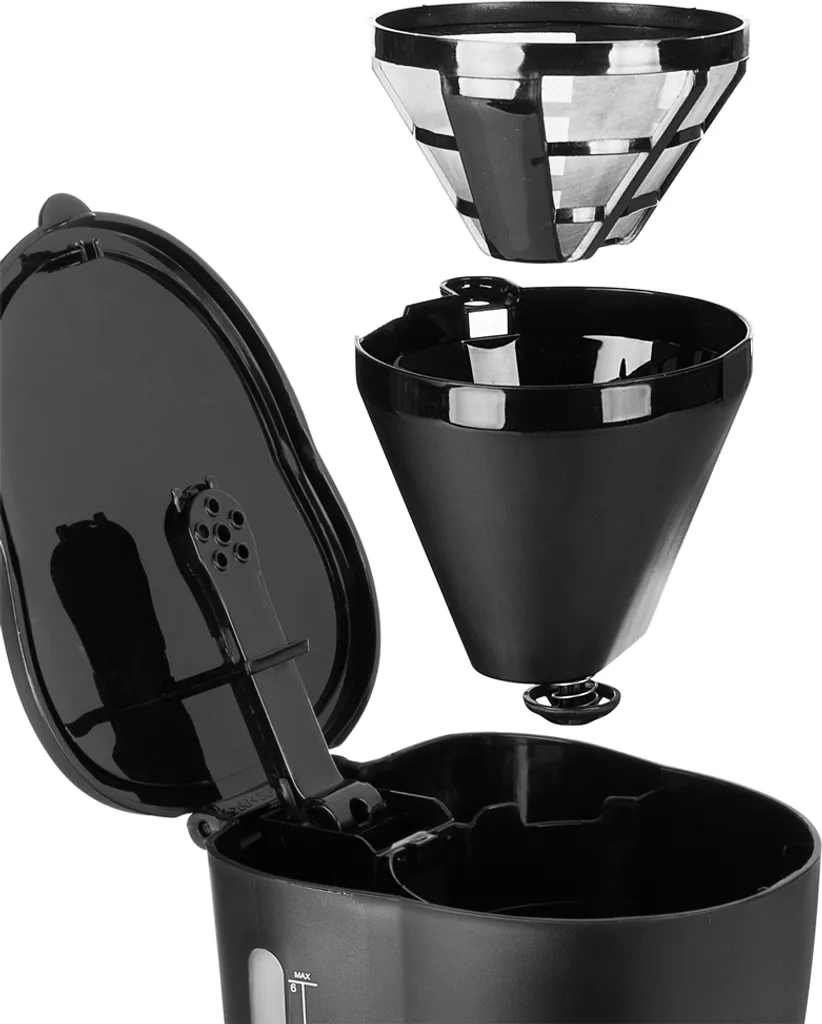 Der Kaffeeautomat ist ein kompaktes und elegantes Gerät in mattschwarzem Design. Mit 600 Watt Leistung eignet sich der Kaffeeautomat auch für den Campingeinsatz. Dank seiner kompakten Größe lässt er sich überall mit hinnehmen. Die Kaffeemaschine hat einen Dauerfilter, der sich leicht reinigen lässt; d. h. Sie brauchen keine Filtertüten mehr.