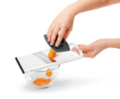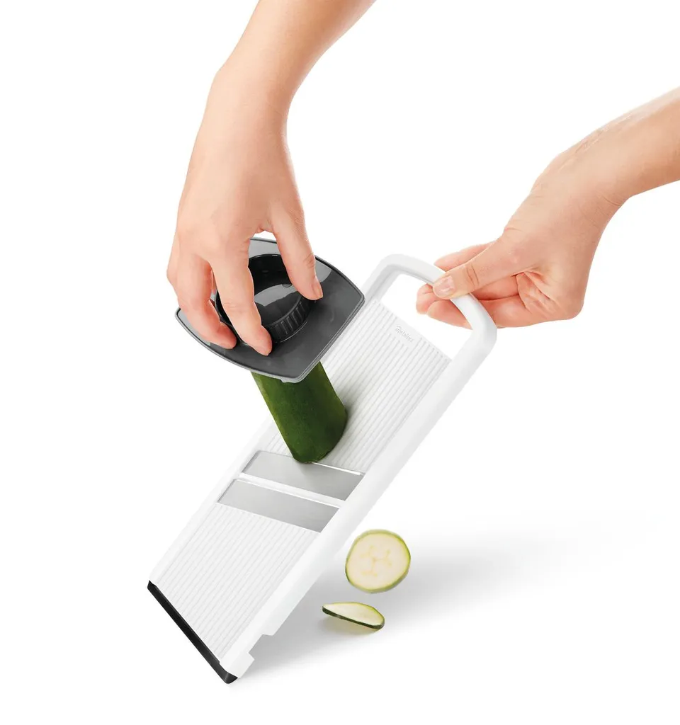 Dank diesem Gemüsehobel mit Restehalter und 2 Edelstahlklingen schneiden Sie Ihr Gemüse