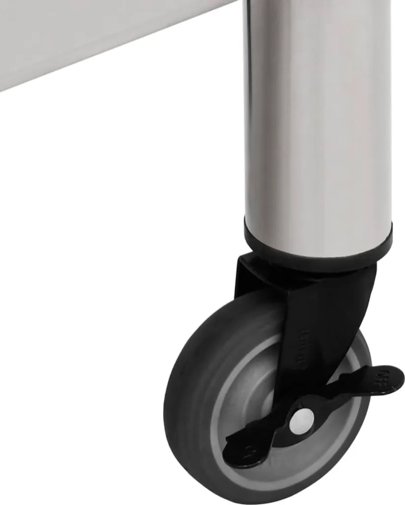 Dieser Gastronomie-Arbeitstisch ist aus Edelstahl gefertigt, ist langlebig für den lebenslangen Einsatz ausgelegt. Die glatte Oberfläche ist korrosionsbeständig und pflegeleicht. Die untere Ablage bietet zusätzlichen Stauraum. Der Gastro-Arbeitstisch verfügt über 4 Rollen, sodass Sie sie frei bewegen können. Darüber hinaus verfügen 2 Rollen über Bremsen, um den Tisch an Ort und Stelle zu halten.