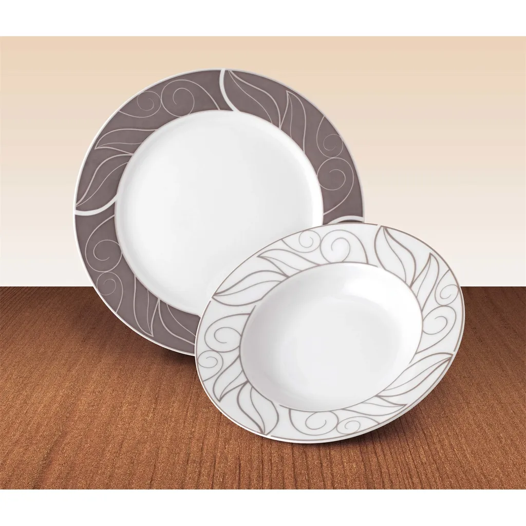 12tlg. Tafelservice ‚Grenoble‘. Runde Form. Weiß mit einemNachbildung in braun-grau. Spülmaschinen- und mikrowellengeeignet. Material: Porzellan. Bestehend aus: 6 Teller tief (22,0 cm ), 6 Teller flach (24,0 cm) Material: Porzellan.